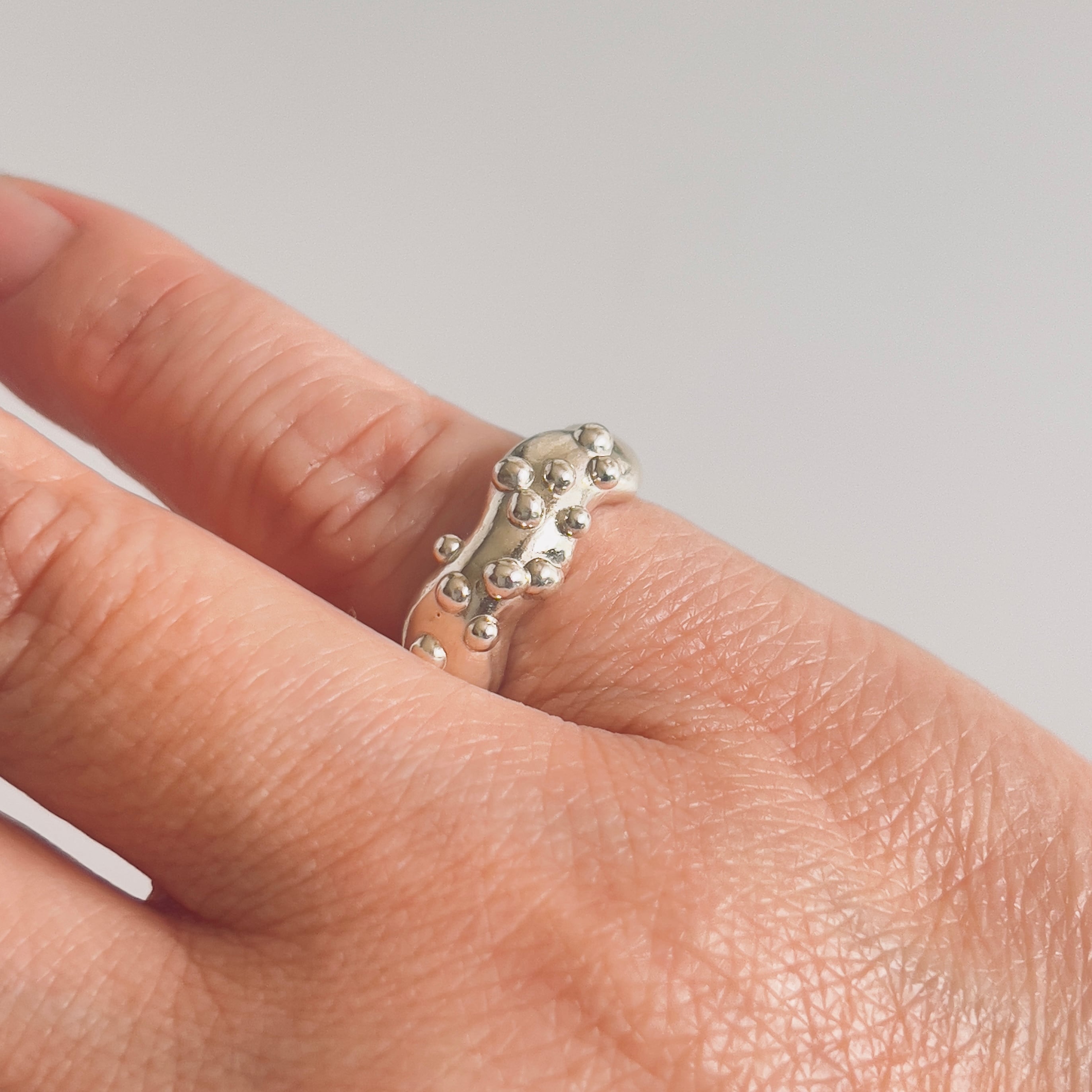 この「海の泡ぶく RING」は、海岸の波打ち際、波の泡や海の輝きをイメージしたデザインが特徴です。海の泡ぶくを模した独特の形状が、上品でありながら遊び心を感じさせます。シンプルな装飾にも、華やかなスタイルにもぴったり。